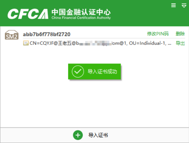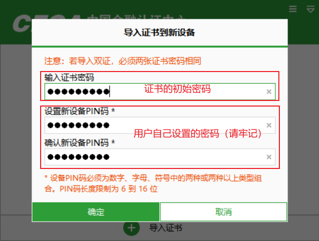 初次导入需要修改证书的默认初始证书密码(PIN码),由用户自定义设置密码(PIN码),此密码在每次登录时会使用,请客户设置完成后牢记此密码。